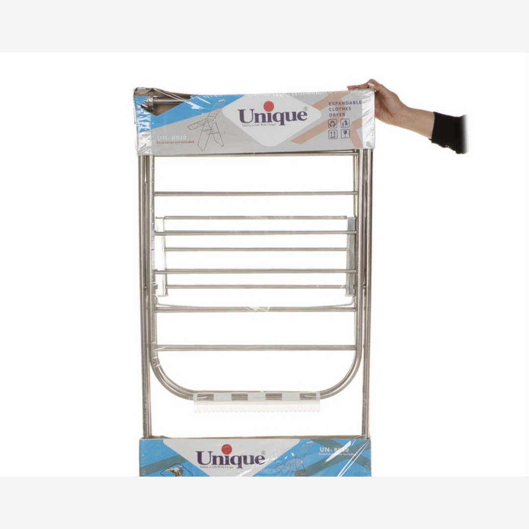 بند رخت یونیک مدل 9001 🔶جنس: استیل با روکش کروم مقاوم دربرابر آب و رطوبت 🔸نوع: تا شو- سبک وزن 🔶دارای بیش از 20 میله 🔶تضمین قیمت، کیفیت و اصالت کالا