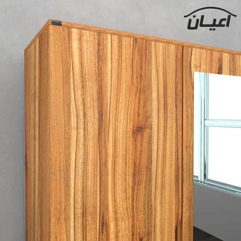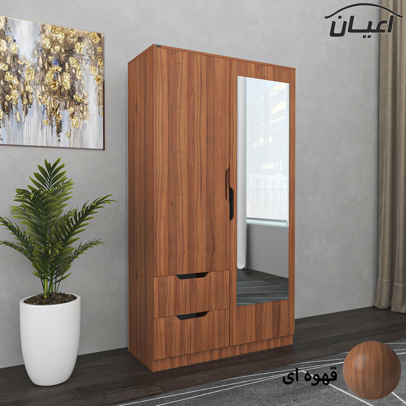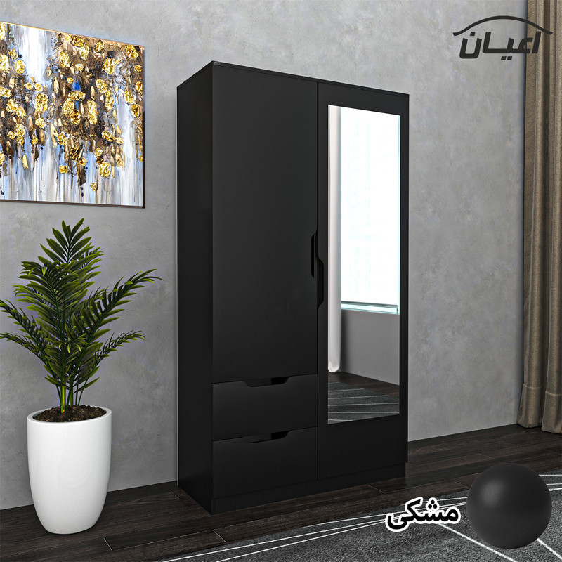 کمد لباس -جنس نئوپان ملامینه شرکتی شامل : دو فضای کمدی هر دو فضا دارای میله رگال است - دارای دو باکس که پشت درب تعبیه شده جهت استفاده برای کیف و کفش - درب ها به صورت آرام بند می باشد- دارای دو طبقه و دارای دو کشو با ریل سه تکه - روی درب آینه تعبیه شده است - دستگیره ها به صورت جای دست و با CNC روی کار تعبیه شده است و فرمی مدرن را به کار داده است-بسته بندی کالا به صورت تک آیتمی است-ال در بسته بندی با لوگوی برند انجام می شود. این کالا توسط برند در رنگ های سفید/مشکی/قهوه ای/قهوه ای روشن/قهوه ای تیره(ونگه)/گردویی /طوسی و حالت چندرنگ (سفید و طوسی )تولید می شود.رنگ بندی این کالا در آلبوم قابل مشاهده است.
